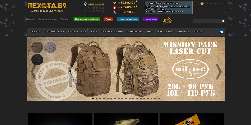 Магазин военной одежды в Минске «Пехота» представляет Вам широкий выбор товаров, который приятно удивит, ведь кроме военной формы и снаряжения у нас можно приобрести и одежду для охоты, рыбалки, страйкбола и просто для активного отдыха. Внушительный выбор качественной одежды и экипировки не оставит безразличными любителей активных военных и спортивных игр, туристов, охотников, рыболовов.
