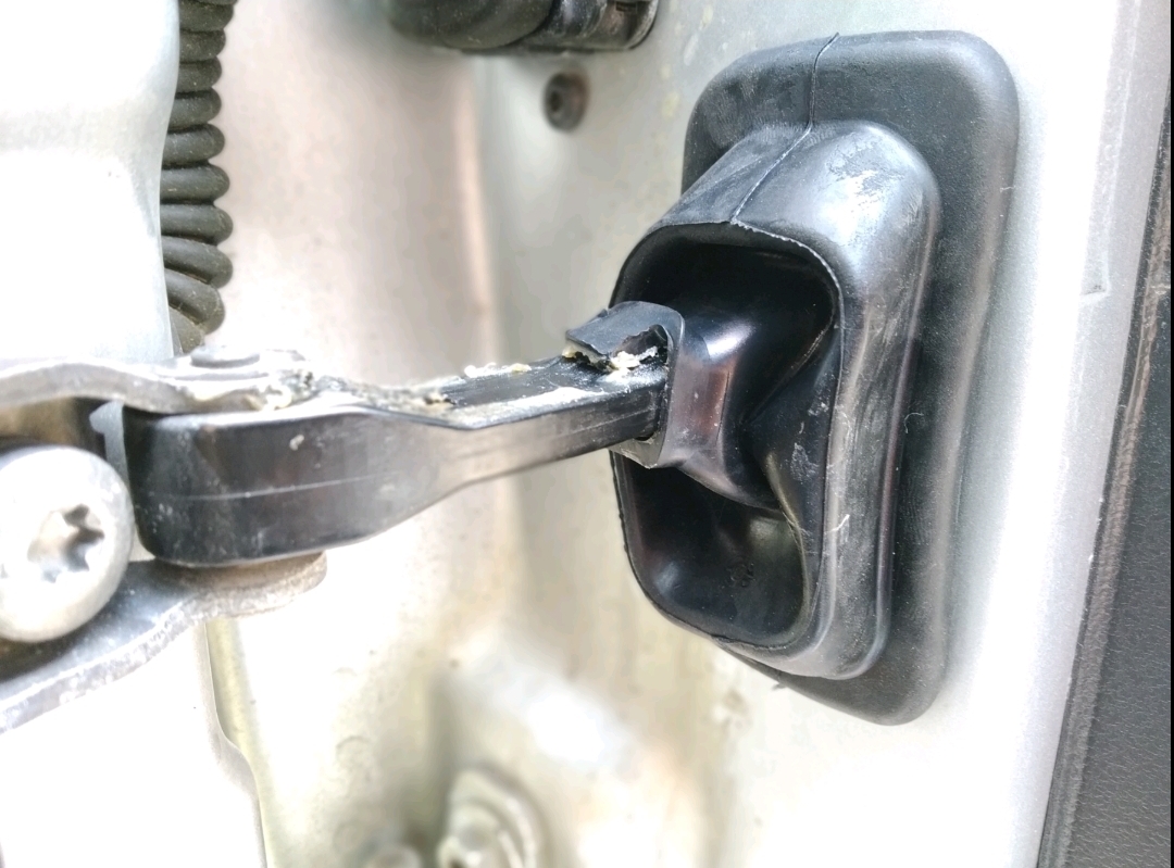 3. Отсоединяем ограничитель двери и одеваем чехол вилки сцепления, заправляя его в паз в двери. Чехол одеваем, чтобы язычок был сверху. Чехол можно одевать как наружной стороной,