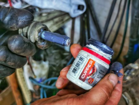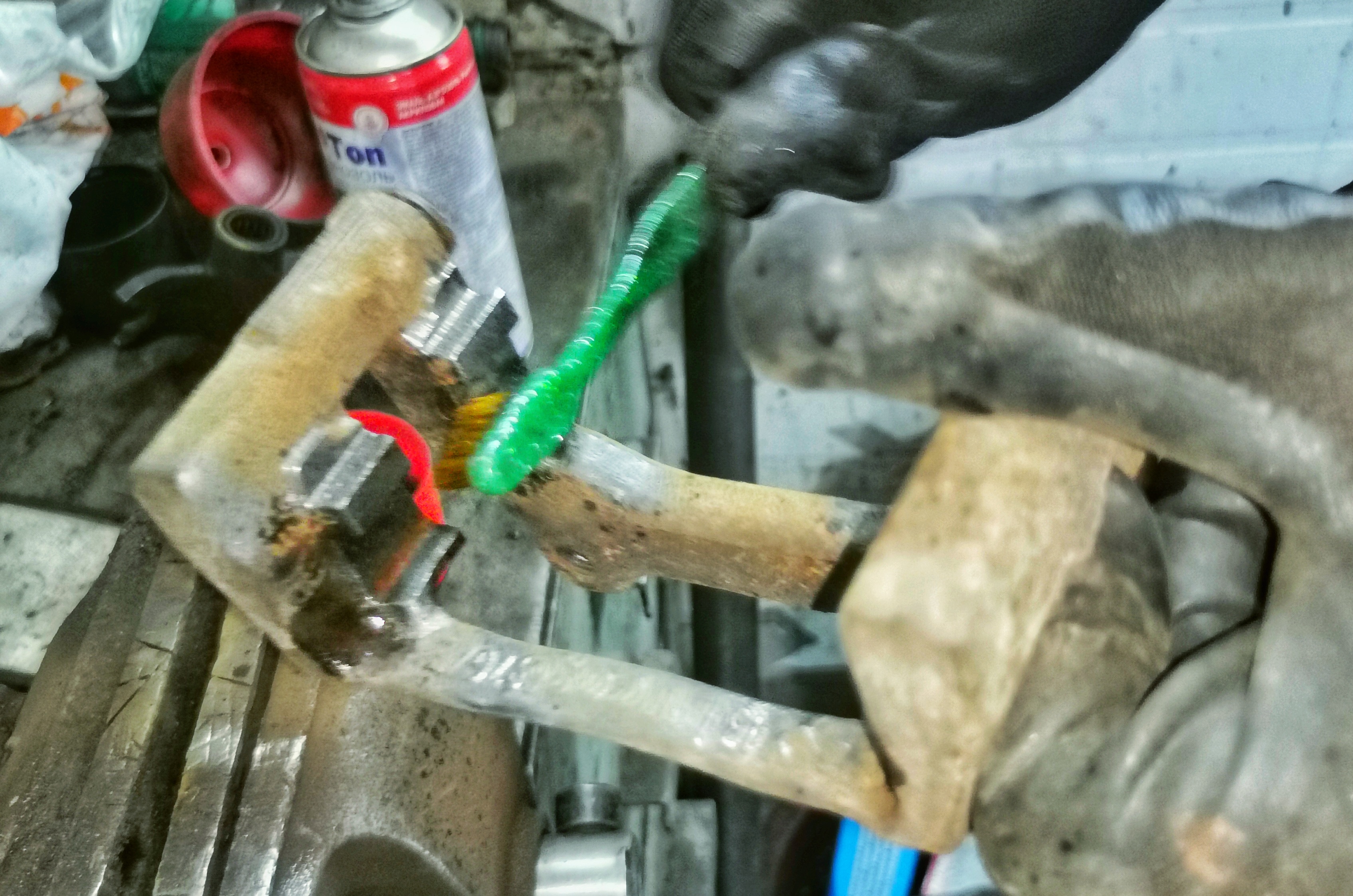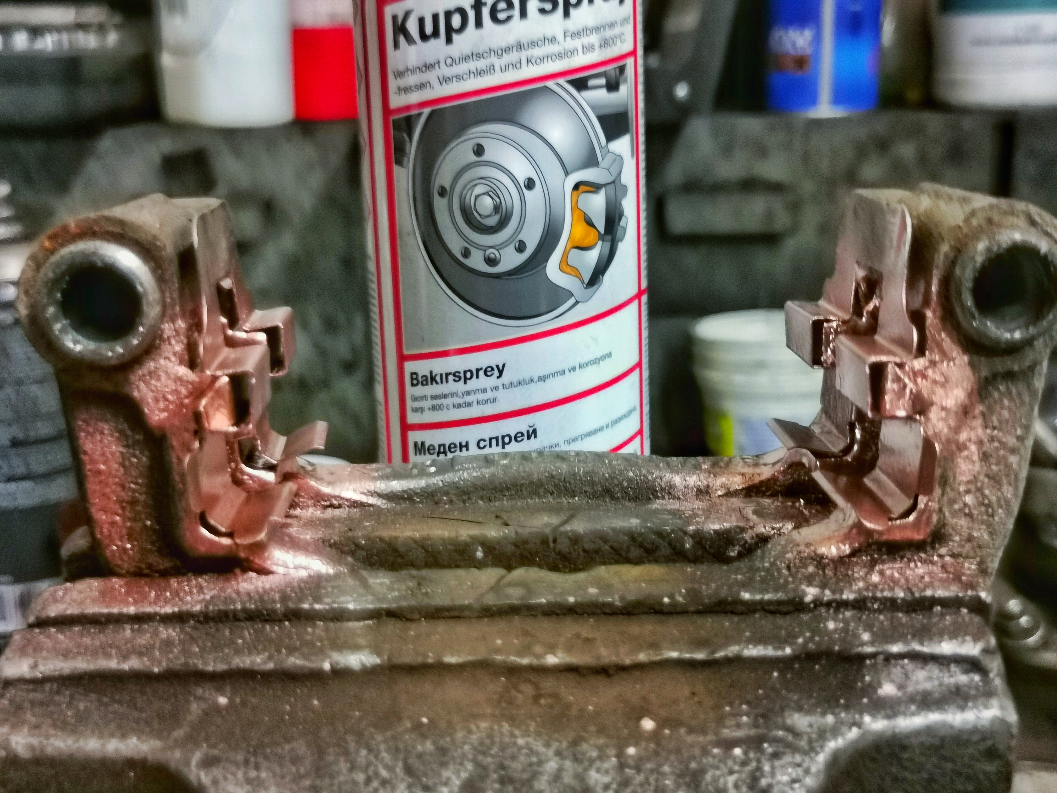 5. Чистка от грязи, а также смазывание направляющих суппорта. Эта важный этап. Использовалась смазка высокотемпературная CUPPER HT-30 для направляющих тормозных колодок и суппортов.